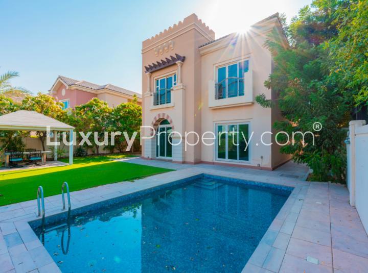 Let us talk about the garden. Stepping outside you can tell someone took their time with the landscaping. This is the sort of place where you will end up spending more time outdoors. The private pool is not just for a quick dip either. It is big enough that you can actually swim and stretch out. The golf course view means more than just a nice photo. Most afternoons you feel the stretch of grass all the way out and every once in a while you catch golfers wandering by in the distance. It is quiet back here but never dull. Sometimes you might find yourself sitting outside as the sun goes down just watching the sky change over the golf course. It is easy to see why villas in Dubai Sports City get so much attention from families looking for a little more space and green views.