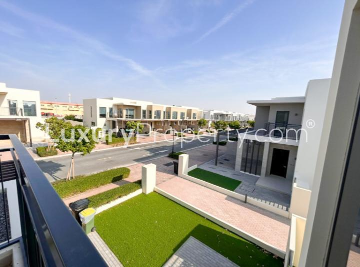 Actually that terrace is going to be your favorite spot on weekends. It faces the morning sun and you can just sit with your coffee and listen to birds or watch a neighbor heading out with their dog. Arabian Ranches 2 is really community focused so you often see families walking or kids riding their bikes in the evening. Even with all that there is this peaceful quality to the street and you just get to enjoy the calm without being cut off.
