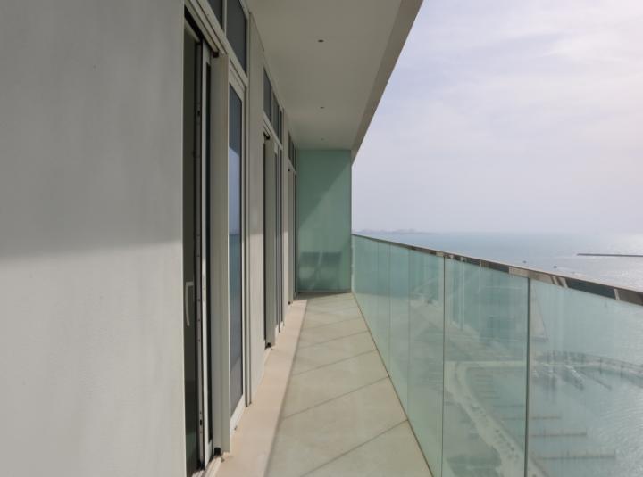 The balcony is larger than you expect, runs from the living room to the bedroom. There is even access from both, so your mornings could start with a cup of coffee outside, maybe slippers on, looking at the horizon. At the end of the day you could sit out, listen to some music, and feel like you are away from everything, even while you are in Dubai. Sometimes you hear the faint call of seagulls and actually forget your phone for a while.