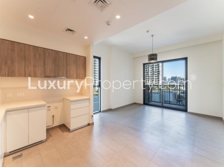 There is a certain calm that hits you when you step into this one bedroom apartment at Executive Residences in Dubai Hills Estate. I remember walking in and just feeling the space open up around me. There is something different about this spot. Maybe it is because you are tucked into a corner of the building so the sunlight sneaks in from another window you would not always expect. The result is these warm highlights stretching across the living room floor and you honestly just pause and look at how bright it feels. Even without any furniture, the place does not echo and it somehow makes you want to stay for a while, not just run out again.
