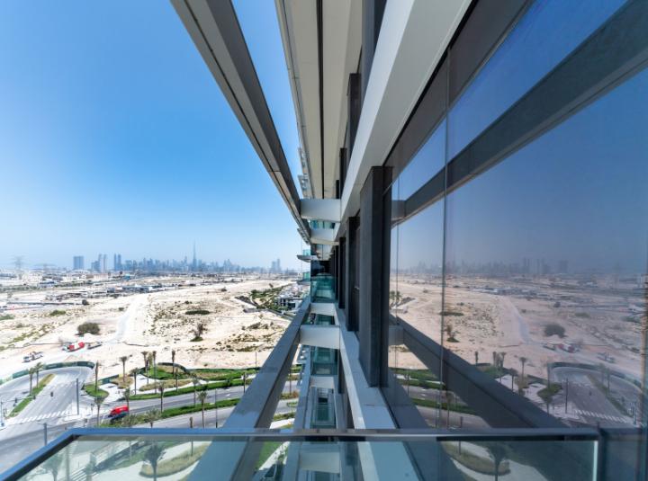 The kitchen is open plan and to be honest, it actually feels like somewhere you would use for more than takeout. I have been in a lot of new Dubai apartments and sometimes the kitchen feels tucked away or a bit of an afterthought. Here, it is right where you want it. If you like having friends over or you just like talking while you cook, you can. Everything is easy to use, new appliances where it matters, and you get that sense of inviting people in. You could genuinely try a new recipe here without bumping into everything. The living area is open, light, and those floor to ceiling windows make it feel like you are living in a treehouse with a city view that never really shouts but just sits there in the background reminding you of all the possibilities.