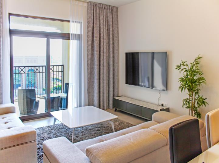 The first thing you see is the open plan living area and it is one of those living rooms where you might imagine yourself coming home after work and sinking into the sofa for a little bit before going out for dinner nearby. Sometimes you hear the distant sound of the fountains from Madinat Jumeirah itself, or you might even catch a breeze if the balcony door is open. The kitchen feels like a proper kitchen, not just an afterthoughtโplenty of room to make your morning coffee, and you would not feel crowded if you wanted to make something more ambitious than toast. Everything is clean and feels pretty much brand new, with appliances that work smoothly, cupboards that open where they should, and a smart finish that looks good in any light.