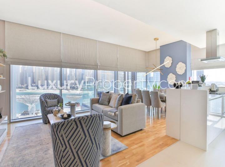 The apartment sits at about two thousand one hundred square feet and the way it soaks up sunshine is actually pretty amazing. You have these full windows everywhere so you never forget you are living on the water because the Arabian Sea is right out there almost wrapping around the place. Sometimes you catch boats going by and it is just your regular Tuesday morning. The balcony is generous enough that a full-sized table and a couple of chairs never feel cramped at all. I can imagine evenings out there just drinking coffee and watching Bluewaters' night lights flicker on. You will probably spot the Ain Dubai wheel from time to time too.