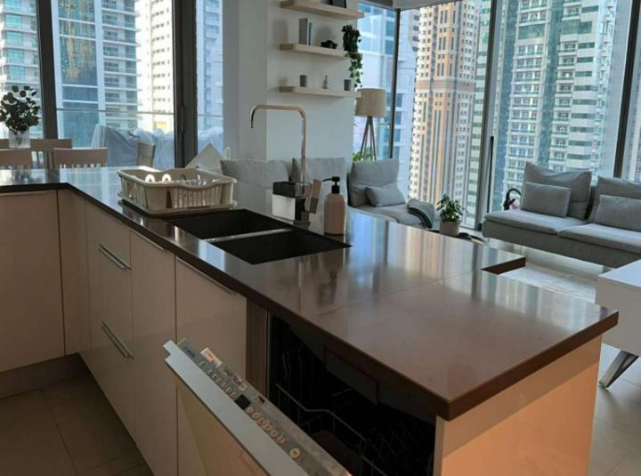 The kitchen is proper open plan so it just sort of spills naturally into the living area. It feels good for actually cooking, not just for stacking takeaway menus. The balcony is big enough for a couple of chairs and a small table if you ever feel like morning coffee or a quiet call in the evening. And from there, you get a proper swimming pool view and just enough of the busy Marina to know you live somewhere special. At night, with all the city lights switched on, it feels like you get your own private show.