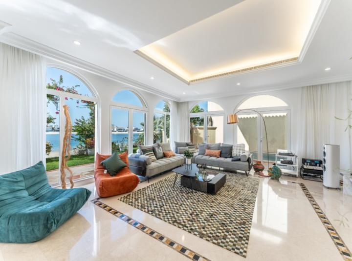 This is a large villa for rent in Palm Jumeirah, but it does not just look big in photos. Once you are in, the openness in the main living area really stands out. You get these moments where sunlight spills through the floor to ceiling windows and suddenly everything feels lighter. It wraps around you in a quiet way and the way the outside comes into the house is just seamless. No heavy barriers between you and that sandy bit of beach right outside. Living and dining spaces melt into each other so well that you almost imagine evenings happening here with doors open and kids or friends moving from inside to the garden. What I like best is that the kitchen feels like somewhere you would actually cook. The shape makes sense everything is justโฆwhere you would want it if you cooked for real not just heated things up for show.