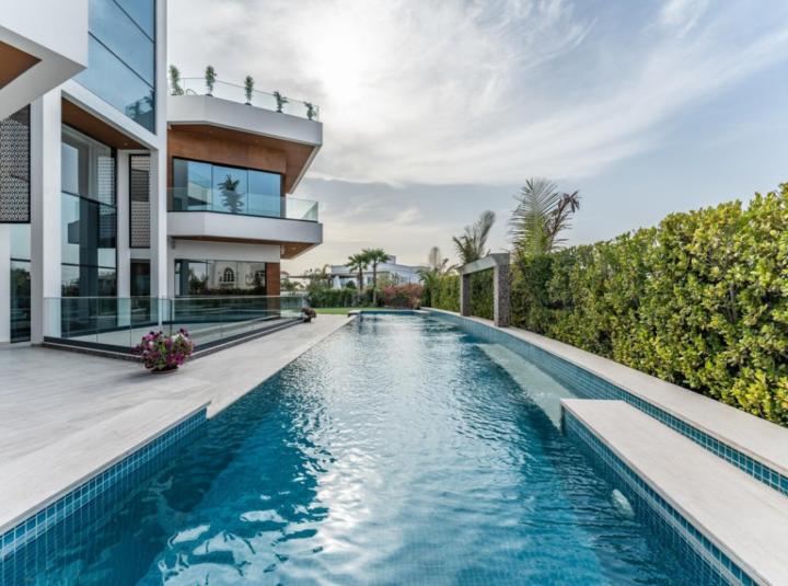 You get a proper sense of separation from the world here. This villa is in a quiet part of Dubai Hills Estate and it is nestled inside Parkway Vistas which is a bit like a peaceful pocket just on the edge of everything. Downtown Dubai is not so far but you do not hear any of that city stuff here. If you open up the big sliding doors out onto the garden, there's almost no sound apart from maybe a bird or two, or the ripple from the swimming pool. And that pool is something else. I have seen a lot of homes with pools but this one is really long, it just keeps going. It is more than enough for swimming laps or even just floating late in the evening when the whole place goes quiet. Sometimes you see families outside, kids with their bikes, or someone walking a dog, but it never feels too busy.